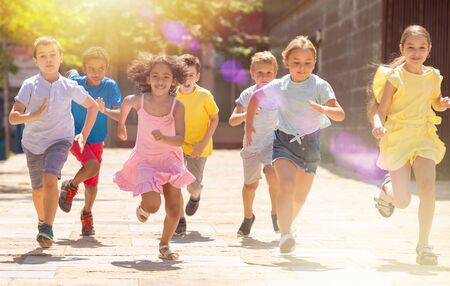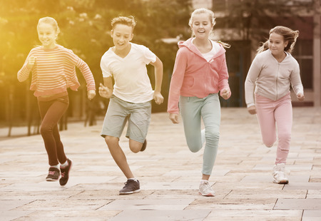 Team of positive kids running in race in the street and laughing outdoors