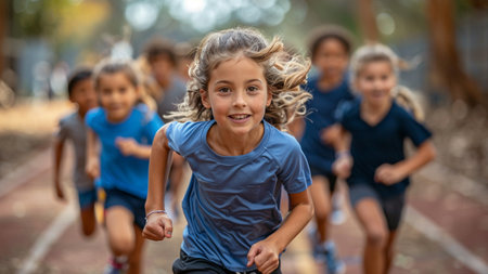 A group of young, smiling children energetically race down a running track, embodying health and happiness.