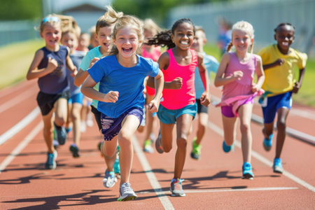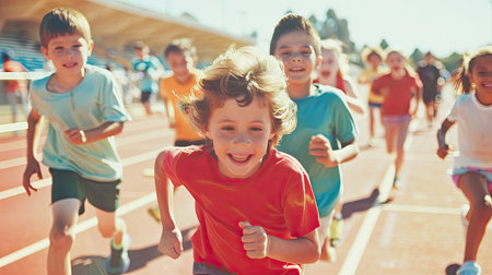 Energetic group of kids joyfully running on outdoor track, representing health, movement, childhood activity, and sports enthusiasm.