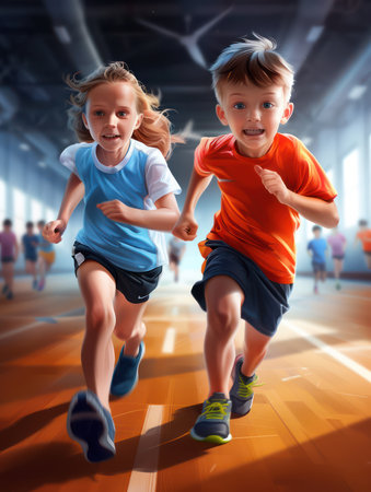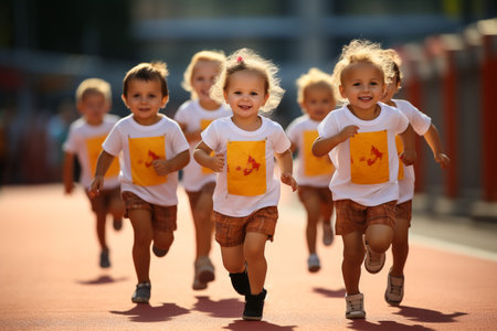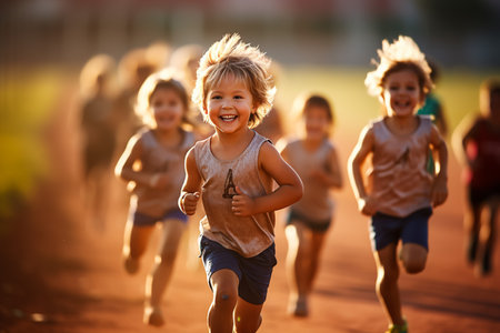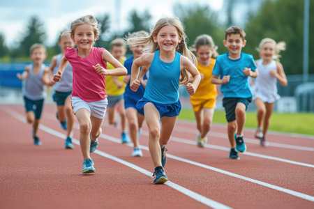 Diverse group of children filled with joy and energy running on athletic track, children healthy active lifestyle concept. AI Generated.