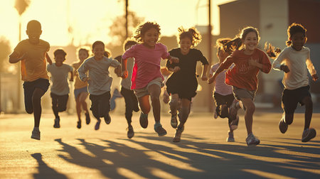A group of children running and smiling in a race, bathed in golden sunlight.