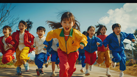 A group of children running outdoors, smiling and full of energy. They are wearing colorful tracksuits.