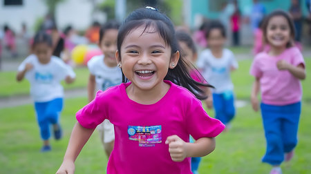 Happy children playing outdoors on a sunny day. A little girl in a pink shirt smiles while running, other children in the background. Green grass