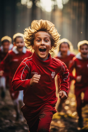 Group of children in red sportswear running in autumn forest.