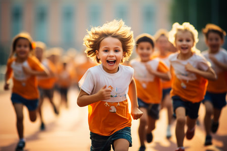 Happy children running on a track during a quadrathlon, having fun together in an active and joyful way