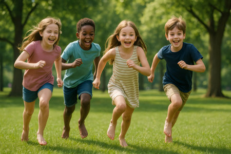 Diverse group of children playing in sunny park setting