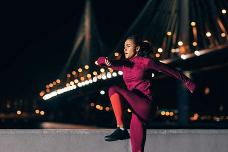 Fit woman doing warming up exercises at night outdoors