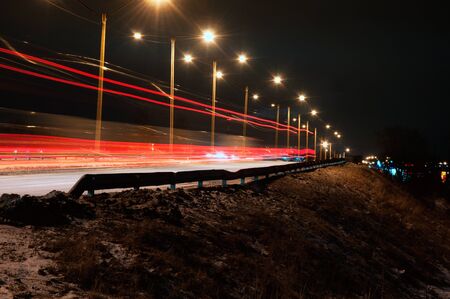 Traces of headlights from cars moving at night on the bridge, illuminated by lanterns. Abstract blured defocused city landscape with highway at dusk.