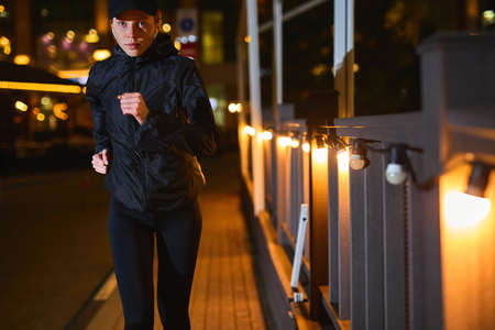 young caucasian woman running by night in city street. Fitness and workout wellness concept. Sports outdoors. Garlands are lighting the street in the night, outdoor sport concept. copy space