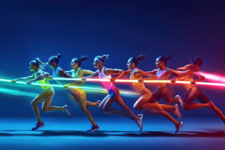Women sprinting with bright light trails, showing speed and athleticism in an evening workout.