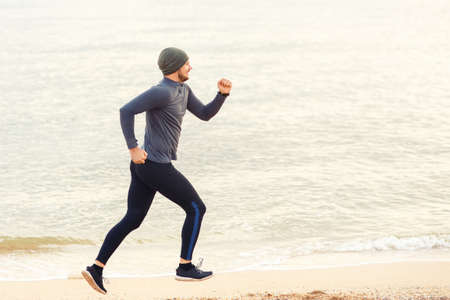 Fit athlete. Handsome adult man running outdoors to stay healthy, at sunset or sunrise. Runner.
