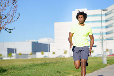 Black athletic man running in an urban park.