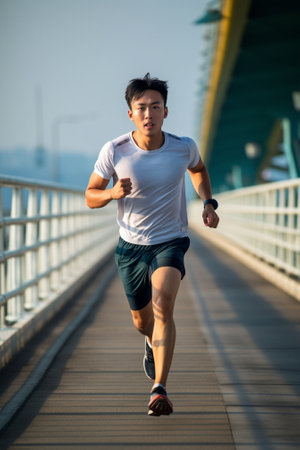 Moving to his goal Side view of confident young man running along the bridge : Generative AI