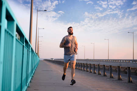 Moving to his goal. Young man running along the bridge