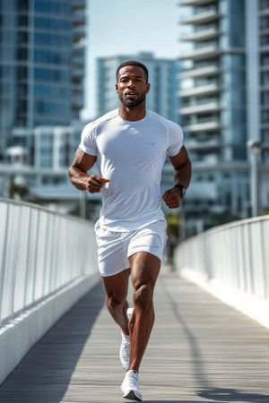 A man runs along a wooden boardwalk flanked by modern buildings on a sunny day, wearing a white athletic outfit and expressing focus and determination.