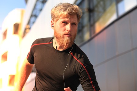 Running man jogging in the city. Sport fitness model caucasian ethnicity training outdoor.