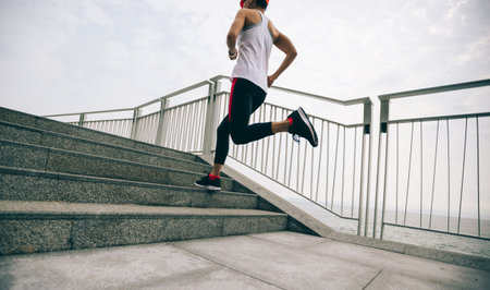 Healthy lifestyle fitness sports woman runner running up stairs on seaside trail