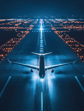 Airplane stands ready for departure on a brightly lit runway, with colorful navigation lights enhancing the nighttime view.