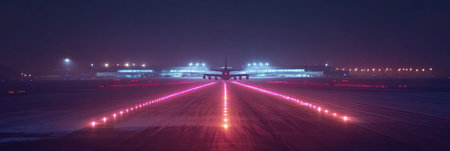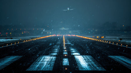 A stunning nighttime scene captures an airplane landing on a wet runway, illuminated by vibrant lights and surrounded by a misty atmosphere, evoking travel emotions.