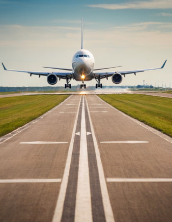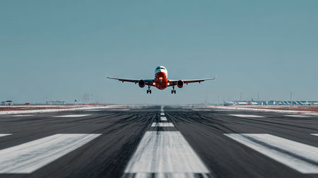 An airplane takes off from a runway, captured against a clear, blue sky. The composition showcases the plane centered, with the runway lines converging towards the horizon. The image features bright colors, suggesting a daytime scene. Suitable for commercial projects or editorial content related to aviation and travel.