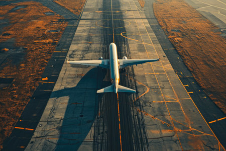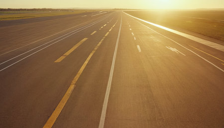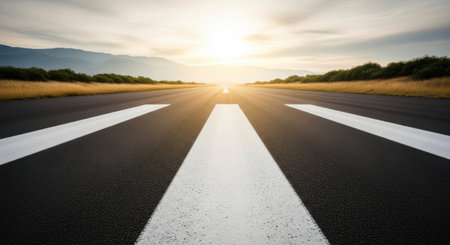 AI Generated. Runway illuminated by soft golden light at dawn with long shadows stretching across the surface