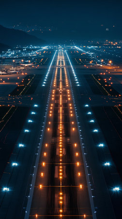 Nightfall casts a golden glow over a bustling urban horizon, as glowing runway markers stretch into the distance, guiding the eye toward a lively cityscape softly blurred