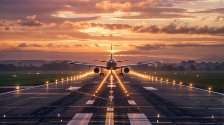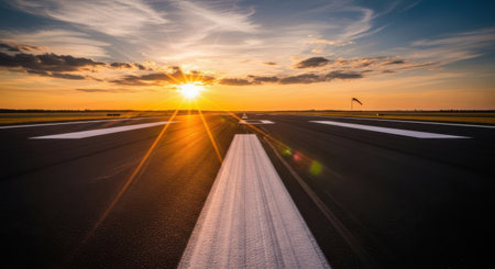 A striking view of an airport runway at sunset, bathed in warm light with clouds painting the sky.