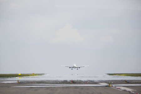 Plane ascending through morning mist and fog after liftoff from wet runway