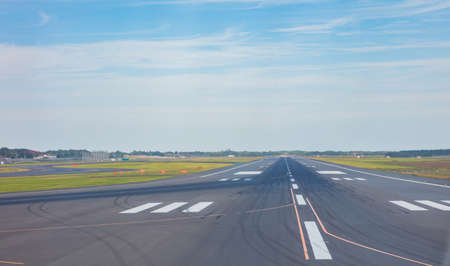 Wide open aerodrome runway under the blue sky with beautiful white clouds and palm trees. Tropical airport strip in summer.