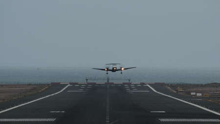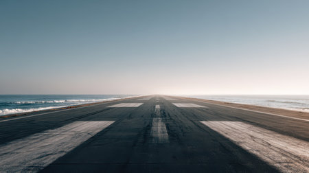 Long empty runway stretching into the ocean horizon, with calm waves visible at the edge.