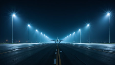 Night airport runway with blue-white lights glowing asphalt and landing airplane in distance