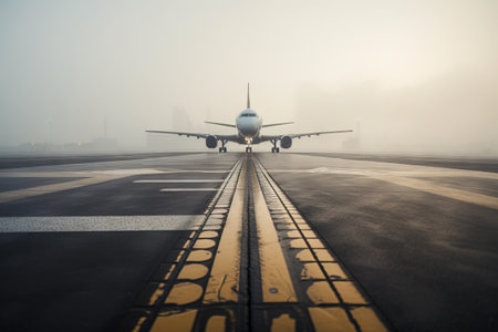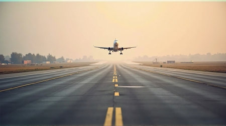 Majestic Commercial Airplane Ascending During Early Morning with Misty Dawn Light Reflecting on Runway