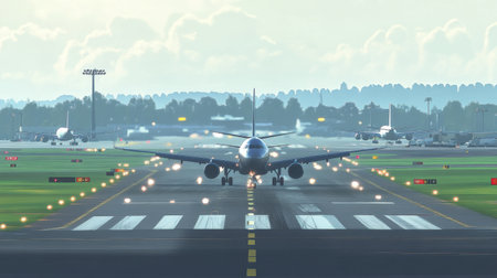 A vibrant airport scene featuring planes preparing for takeoff on a busy runway, surrounded by clear skies and inviting atmosphere. Ideal for travel themes.