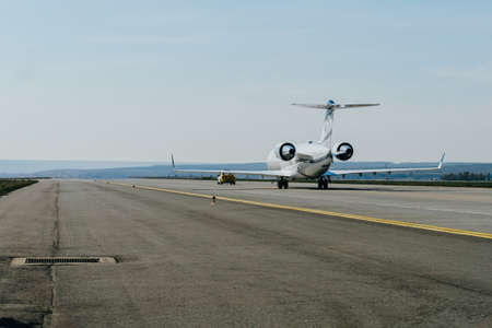 Rostov-on-Don, Platov Airport / Russia - 04 October 2019: A small passenger plane follows the escort vehicle after landing at Platov airport during the official spotting