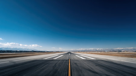 An empty airport runway under a clear blue sky, perfect for showcasing aviation and travel themes, wide-angle view