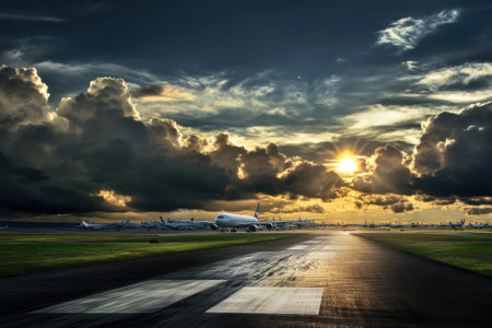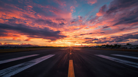 A beautiful runway under a captivating sunset, featuring stunning clouds and soft light, presenting a serene atmosphere ideal for travel and adventure enthusiasts.