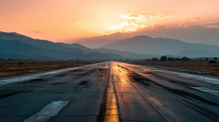 Deserted airport runway at sunrise, golden light reflecting on the asphalt with mountains faintly visible in the distance.