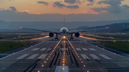 A modern aircraft makes a dramatic landing against a twilight backdrop, with vibrant lights illuminating the runway, creating a captivating travel moment.