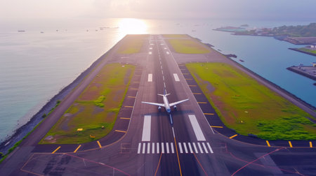 An airplane takes flight from a runway, set against a backdrop of mountains and water. The image features a symmetrical composition, with warm tones dominating the scene. The lighting suggests either sunrise or sunset, creating a dramatic atmosphere. This image could be used for various commercial or editorial purposes.
