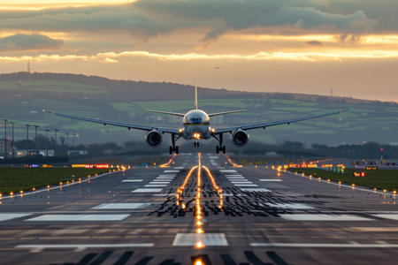 A stunning scene of an airplane landing at sunset, showcasing a warm color palette. The moment captures the beauty of travel and the tranquility of the evening sky.