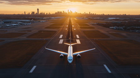 An airplane sits on the runway during a stunning sunset, framing a vibrant city skyline. This scene captures the essence of travel and aviation with dramatic lighting.