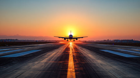 Powerful jet airplane taking off from runway at sunrise, symbolizing ambition and global travel.