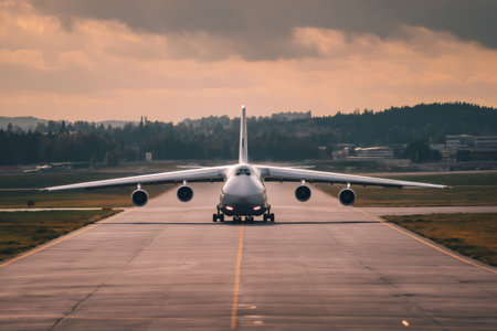 Powerful jet engines roaring while a cargo plane taxis down the runway, gearing up for an imminent takeoff into the sky