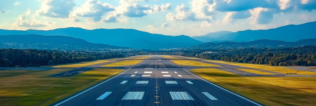 Aerial View of Airport Runway Surrounded by Scenic Mountains and Clouds, Adventure Awaits