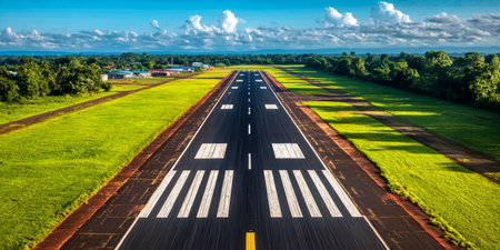 Aerial View of Airport Runway Surrounded by Green Grass, Markings, and Asphalt for Aviation Safety
