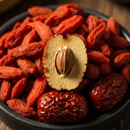 Extreme close-up macro shot capturing the sharp textural detail of dried goji berries and a sliced d
