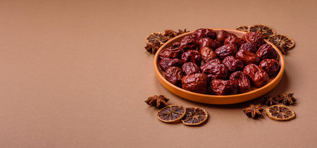 Red date fruits on a plate. Dried jujube fruits.