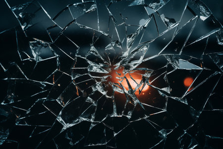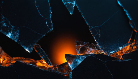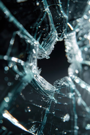 This stunning image showcases shattered glass pieces catching glimmers of light against a dark backdrop, creating an intriguing abstract effect.