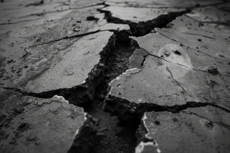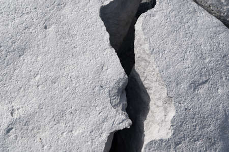 This image presents a close-up view of a cracked concrete surface. The rough texture reveals gray tones with areas of light and shadow, indicating a textured and weathered appearance. The composition emphasizes the cracks, suggesting age and deterioration. This visual is suitable for use in various commercial and design projects.