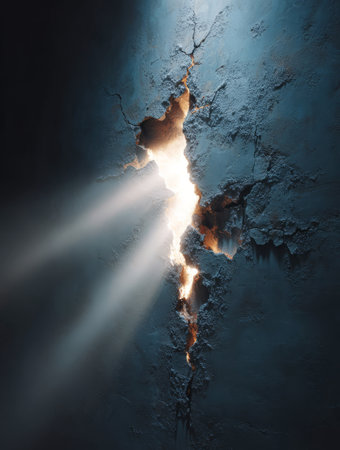 Light beams bursting from a glowing crack in a dark concrete wall surface